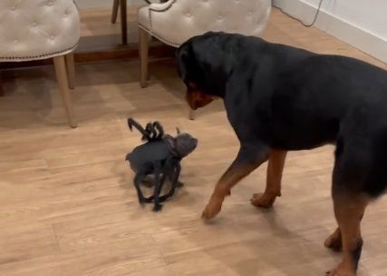 Zbunjeno i s oprezom, rotvajler je gledao psića, ne znajući je li ovaj čudni "pauk" njegov prijatelj ili prijetnja. Maleni buldog, svjestan svoje nadmoći u kostimu, iskoristio je trenutak i ponašao se kao pravi šef.